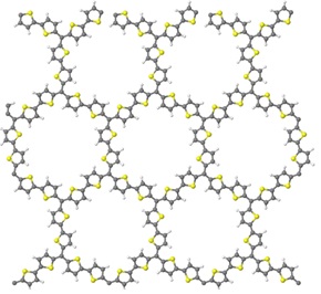 polymère conjugué-2D («2D-polythiophène ») présentant une structure en nid d'abeilles qui se comporte comme le graphène [carbone (noir), hydrogène (blanc), soufre (jaune)].© CNRS / Institute of Materials Jean Rouxel