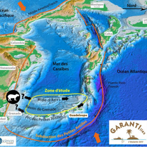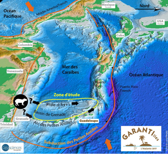 La zone couverte s’étend sur 700 km de latitude et 300 km de longitude. Elle couvre un domaine sous-marin qui comprend un haut-fond allongé appelé Ride d’Aves et le Bassin de Grenade plus profond. La campagne GARANTI, dirigée par deux membres du laboratoire Géosciences Montpellier, rassemble de nombreux chercheur.es et ingénieur.es de ce laboratoire ainsi que des laboratoires partenaires, notamment le Laboratoire Géosciences Océan.