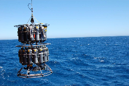 Mise à l’eau d’une rosette de bouteilles de prélèvement lors de la dernière campagne Ovide en 2016, sur le bateau espagnol Sarmiento de Gamboa. Salinité, pH, alkalinité, teneur en oxygène dissous, en sels nutritifs, en fréon et en carbone © P. Lherminier