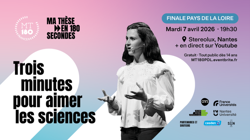 Le concours de vulgarisation scientifique « Ma thèse en 180 secondes » revient en 2026 pour sa treizième édition. La finale ligérienne se déroulera le mardi 7 avril au Stereolux à Nantes, à partir de 19h30. 14 doctorantes et doctorants relèveront le défi d'expliquer leur sujet de recherche en français à l’attention du grand public, de la façon la plus simple possible, en seulement trois minutes chrono !
