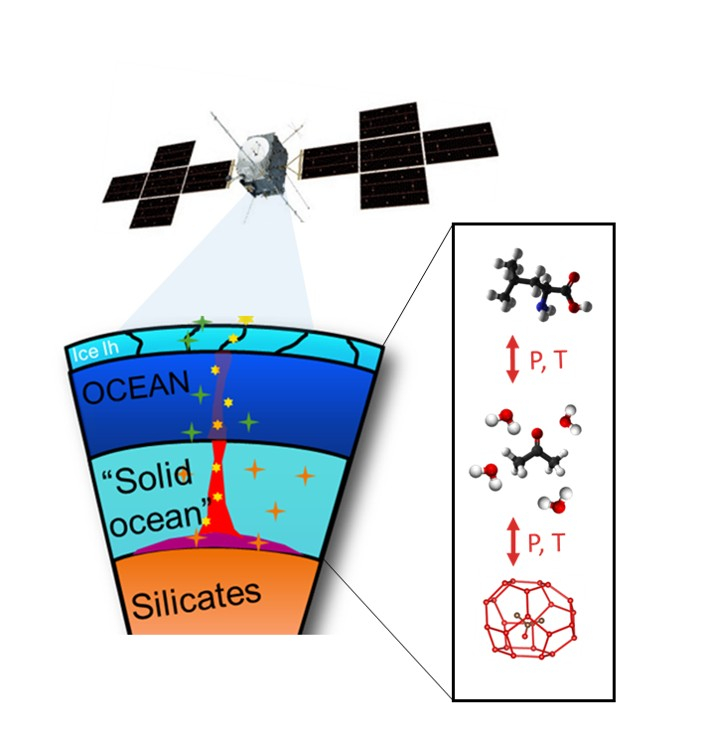 L'eau liquide est un élément essentiel à l'émergence de la vie, ce qui explique le vif intérêt porté aux mondes océans extraterrestres. Ces grandes lunes glacées, telles que Europe, Titan, Ganymède ou Callisto, possédant de vastes océans sous leur surface, possèdent des hydrosphères beaucoup plus épaisses que sur Terre. Les conditions de pression sont donc très différentes, pouvant mener à des effets de cristallisation et d’évolution particuliers. Divers composés organiques volatils sont présents dans ces océans extraterrestres, et pourraient servir de précurseurs biologiques. Cependant les informations concernant leur évolution chimique dans des conditions de haute pression en milieu aqueux sont quasi inexistantes. L'équipe OCEAN, dirigée par Anna Pakhomova, comblera cette lacune en appliquant des techniques in-situ avancées pour étudier l'évolution des composés organiques volatils au sein des mondes océans. Grâce à une base de données de spectres infrarouges de mélanges gelés contenant des composés organiques, OCEAN fournira une référence cruciale pour l'interprétation des futures données de composition issues des missions spatiales (dont JUICE et Europa Clipper) et pour l'évaluation du potentiel astrobiologique des grande lunes océans du système solaire externe.